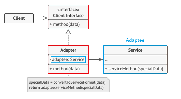 - Adaptee(Service)를 따로 클래스 멤버로 설정하고 위임을 통해 동작을 매치시킨다.